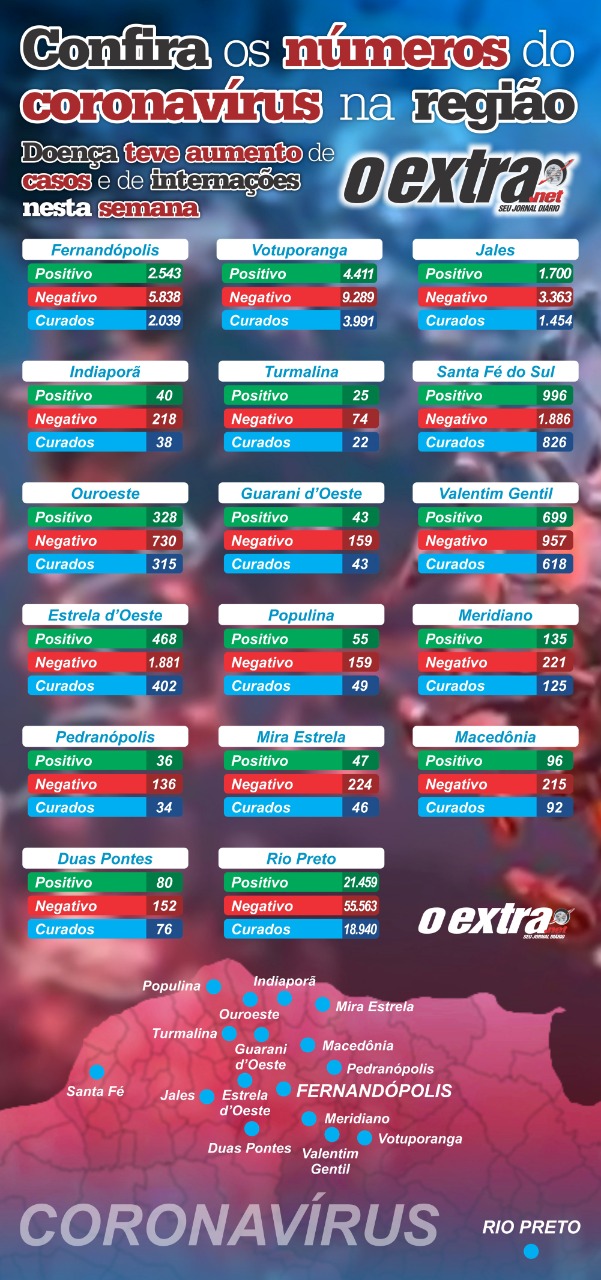 Santa Fé do Sul termina a semana com 966 casos positivos e 35 óbitos, maior taxa de letalidade da região. Jales tem 1,7 mil casos e chegou a 3.363 testes negativos e 35 mortes pela doença.