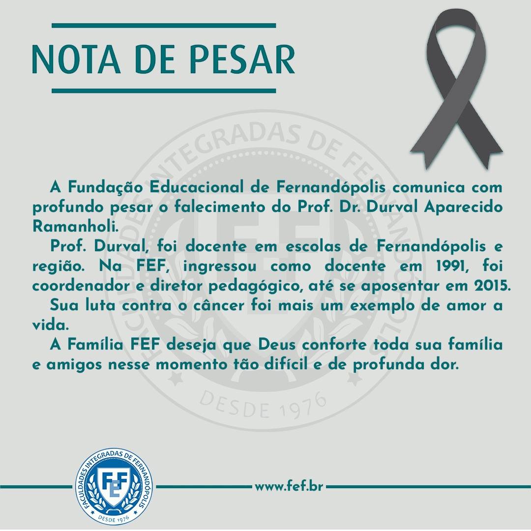 Na tarde desta segunda-feira, dia 28, a Fundação Educacional de Fernandópolis (FEF), em nota, lamentou o falecimento do professor Durval Aparecido Ramanholi, que foi docente em escolas de Fernandópolis e região.