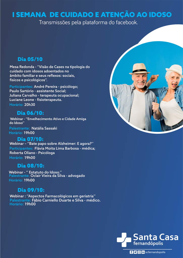 De 5 a 9 de outubro a Santa Casa Fernandópolis realizará a "I Semana de Cuidado e Atenção ao Idoso". As atividades serão transmitidas pela página oficial do Hospital no Facebook.