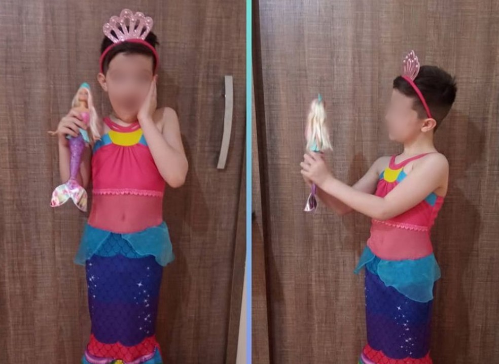 A mãe relatou que levou o filho a uma loja e o deixou comprar o que quisesse. O menino escolheu um jogo, uma boneca e a fantasia de sereia.