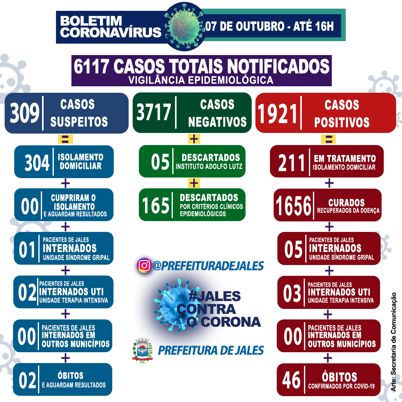 Com pesar o Boletim Epidemiológico também registrou outros dois óbitos no município: um confirmado para a Covid-19, de um senhor de 81 anos, ocorrido na tarde de terça-feira, dia 06 de outubro, e que estava internado na ala de Síndromes Gripais da Santa Casa de Jales, e um óbito suspeito de um homem de 55 anos, na madrugada de hoje, dia 07 de outubro, na UPA 24 Horas.