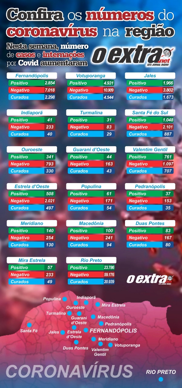 Santa Fé do Sul termina a semana com 1.048 casos positivos e 38 óbitos. Jales tem quase 2 mil casos e chegou a 3.802 testes negativos e 50 mortes pela doença, assumindo o posto de maior taxa de letalidade da região.