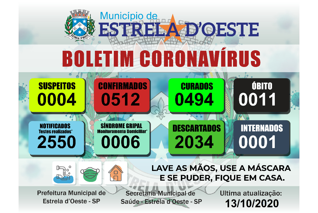O boletim coronavírus divulgado pela Prefeitura de Estrela d'Oeste nesta terça-feira, 13, mostra que o município tem 512 casos positivos da doença.