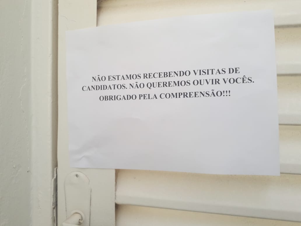 "Não estamos recebendo visitas de candidatos. Não queremos ouvir vocês. Obrigado pela compreensão", informa o cartaz colocado na porta de entrada da residência.