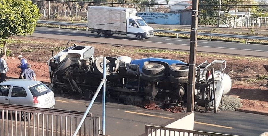 Um caminhão betoneira carregado com concreto tombou e segue 'preso' no buraco formado na Avenida Marginal Alcebiades Bernardes no Distrito Industrial III em Jales.