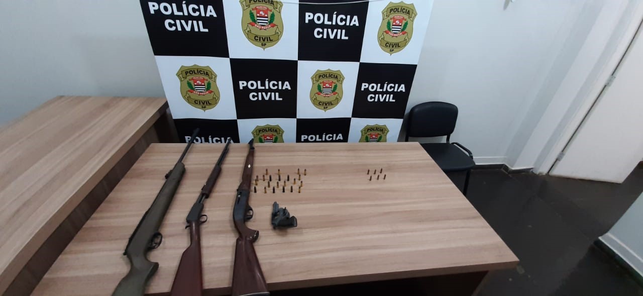 De acordo com a Polícia, na ocasião, foram apreendidas, em uma das residências do suspeito E.M.A. três armas de fogos, sendo duas espingardas calibre 22 e 23 munições calibre 38 e um revólver calibre 32, contendo em seu interior seis munições íntegras, de propriedade do caseiro A.N.