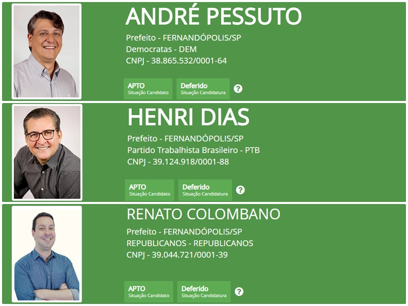 As candidaturas dos candidatos a prefeito André Pessuto (DEM), Henri Dias (PTB) e Renato Colombano (Republicanos) já aparecem como “deferidas” e estão liberadas, sem impedimentos legais prévios, a constar nas urnas na eleição de 15 de novembro.