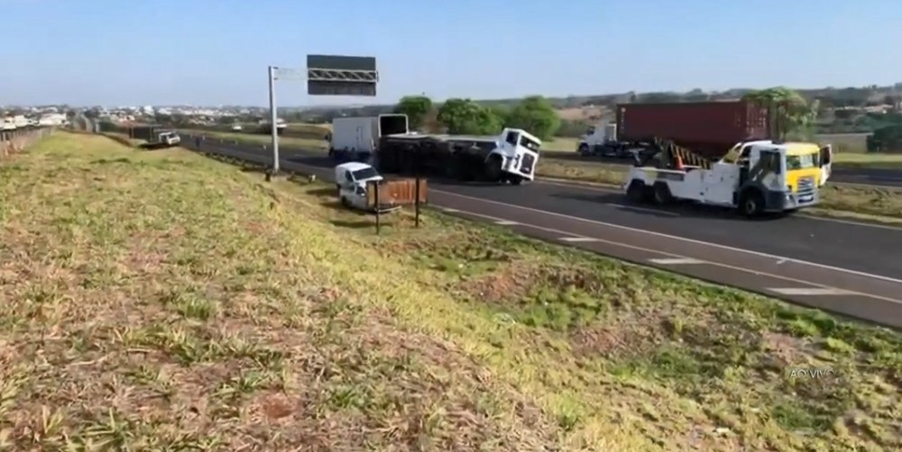 Caminhão tomba e interdita pista da Rodovia Euclides da Cunha em Votuporanga