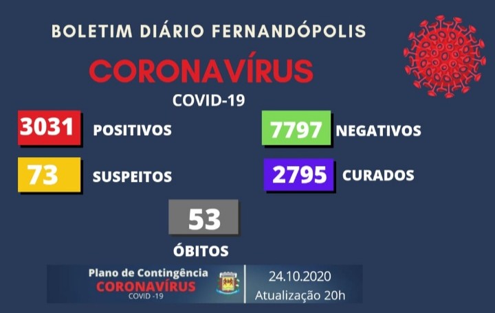 Fernandópolis registrou neste sábado, 24, mais 10 testes positivos para coronavírus. O município tem agora 3.031 infectados pela doença.
