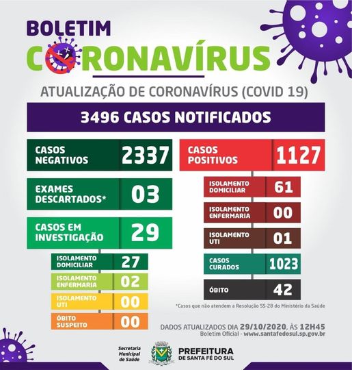 A Secretaria Municipal de Saúde da Estância Turística de Santa Fé do Sul, comunicou mais um óbito por Covid-19, o 42º registrado no município.