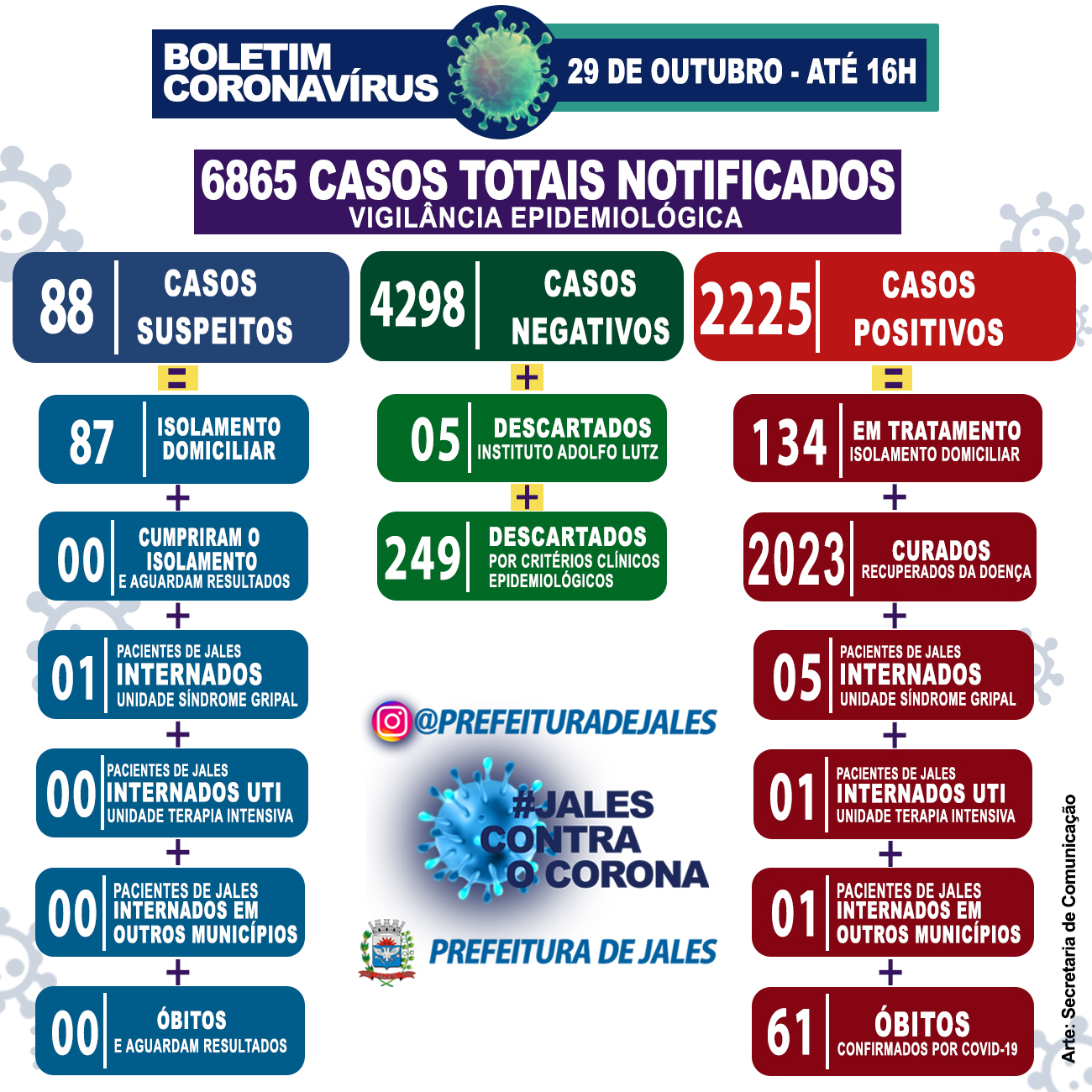 Na atualização desta quinta-feira, houve o registro de 26 casos suspeitos notificados para a Covid-19 (Coronavírus) em Jales. Entre estes casos ou outros já notificados anteriormente, 07 testaram como negativos e 06 foram descartados por critérios epidemiológicos.