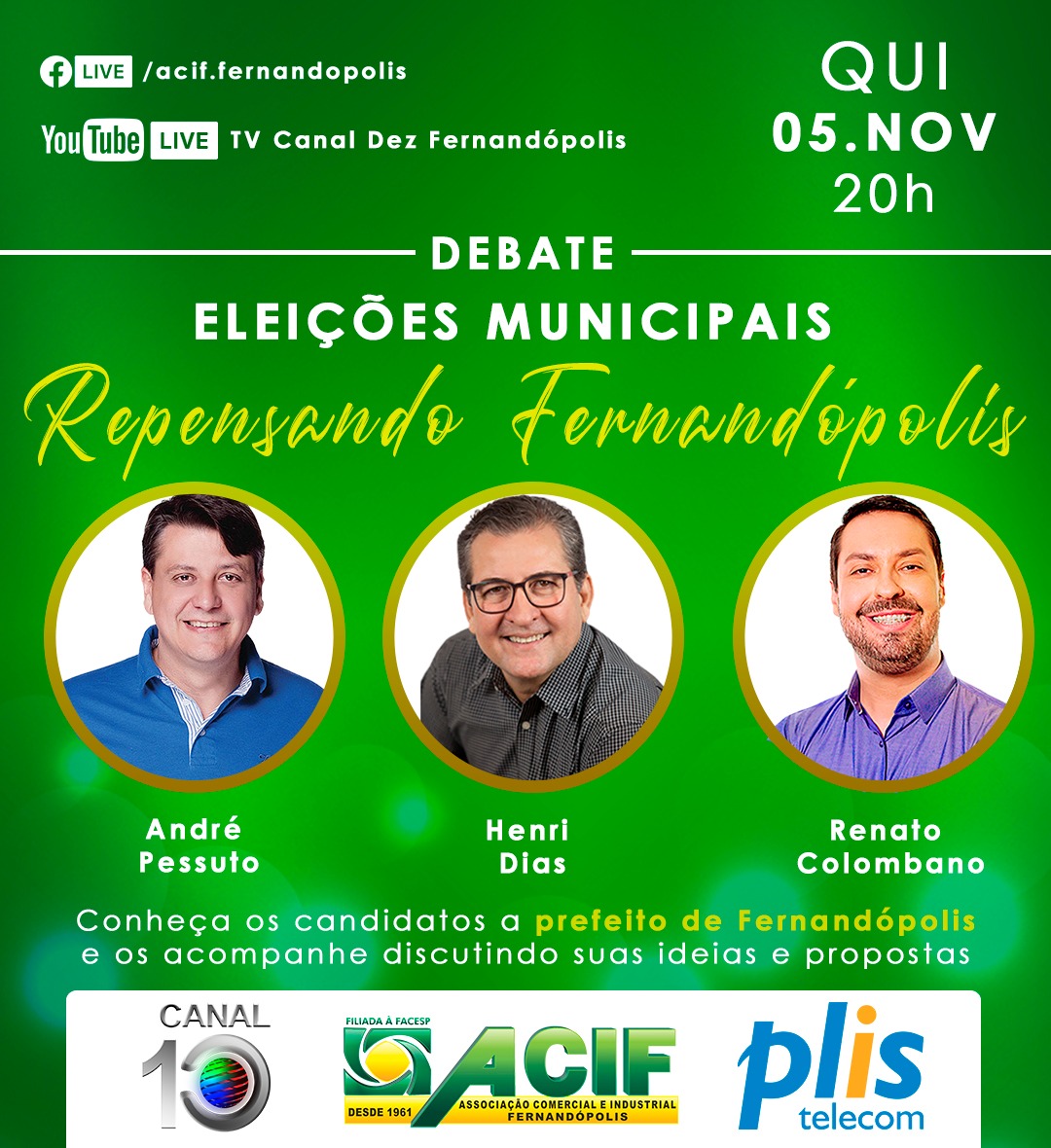 A Associação Comercial e Industrial de Fernandópolis realizará nesta quinta-feira, 05 de Novembro, as 20h, o debate entre os candidatos à Prefeitura Fernandópolis, em parceria com o Canal 10 e a Plis Telecom.