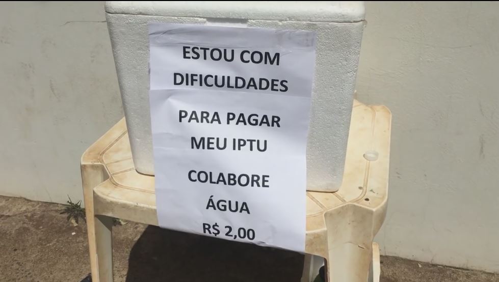 Dona Santina, que precisa do dinheiro das vendas das garrafas de água para quitar o referido imposto atrasado, vai às ruas todos os dias com uma caixa de isopor, na qual armazena as garrafas de água. Com um cartaz fixado na caixa ela salienta a sua dificuldade: “estou com dificuldades para pagar o meu IPTU. Colabore. Água R$ 2.