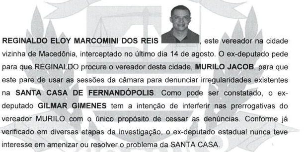 Segundo o inquérito, Marcomini mostrou interesse na provedoria para “atender possível pedido” do parlamentar. A autoridade policial prossegue afirmando que a escolha do vereador “certamente possibilitará que Gilmar Gimenes volte a ter influência na direção da instituição”.