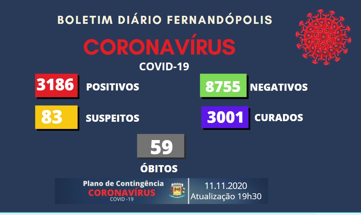 Fernandópolis registrou nesta quarta-feira, 11, mais 21 testes positivos para coronavírus. O município soma 3.186 infectados pela doença.