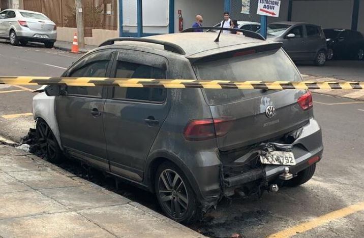 O carro estava estacionado na rua Siqueira Campos quando o homem se aproximou e ateou fogo. Ele tinha um galão em mãos e jogou o líquido no carro. Assim que as chamas começaram ele fugiu.