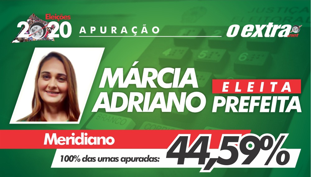 Márcia Adriano (Avante) foi eleita prefeita de Meridiano, neste domingo, 15. Márcia teve 1.326 votos, o que corresponde a 44,59% dos votos válidos. Seus oponentes, Lindo (DEM) teve 1.155 votos (38,84% dos votos válidos) e o atual prefeito Maicon Japonês teve 493 votos (16,58% dos votos válidos).
