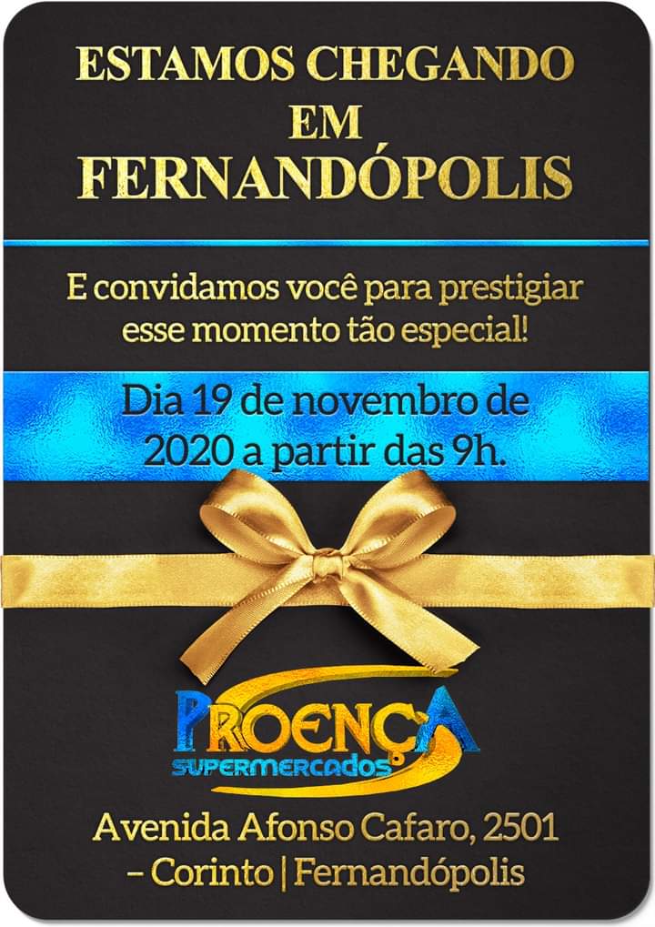 Conforme antecipado pela coluna Entre Linhas na semana passada, o Supermercado Proença de Fernandópolis vai ser inaugurado nesta quinta-feira, 19. No texto, assinado pelo articulista Beto Iquegami, cravava que a unidade da rede no município seria inaugurada antes do dia 25.