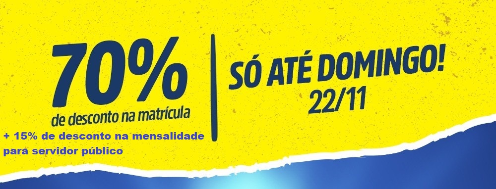 Servidor público tem desconto de 70% na matrícula mais 15% de desconto na mensalidade. A escola estará aberta no domingo, dia 22, atendendo das 9h até 16h.