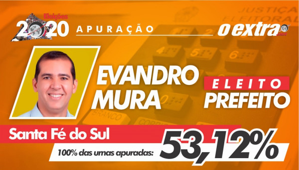 No último domingo, 15, Evandro Mura (PSL) foi eleito prefeito de Santa Fé do Sul. Evandro teve 9.292 votos, o que corresponde a 53,12% dos votos válidos. Ademir (DEM) teve 7.051 votos (40,31%), Milaine Calazans (REPUBLICANOS) teve 810 votos (4,63%), Edson Ferreira Negão do Rádio (PC do B) teve 279 votos e Toninho do Taxi (PATRIOTA) teve 61 votos (0,35%).