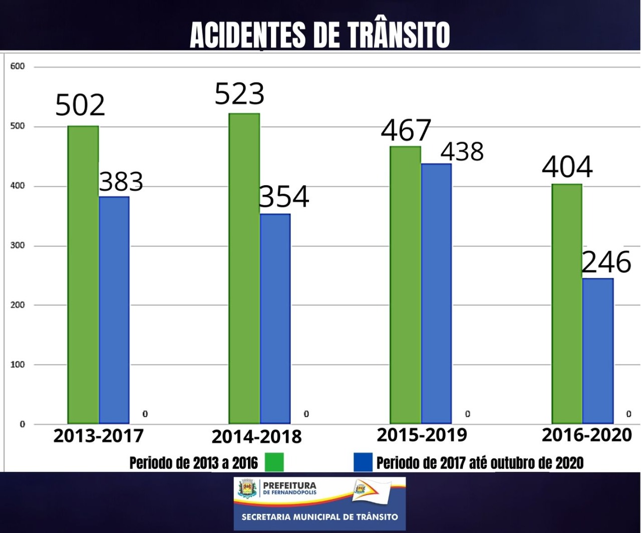 Enquanto a quantidade de veículos de Fernandópolis cresceu significativamente nos últimos anos, o número de acidentes de trânsito teve uma reação inversa, com redução de 43,83% nos últimos quatro anos. Os dados são da Secretaria de Segurança Pública do Estado de São Paulo e também da Só Folha/Prodesp.