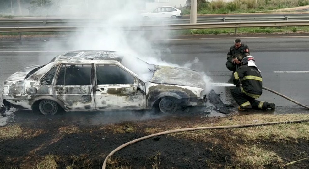Um carro ficou completamente destruído após pegar fogo na Rodovia BR-153, em São José do Rio Preto, na tarde desta terça-feira, 1º.