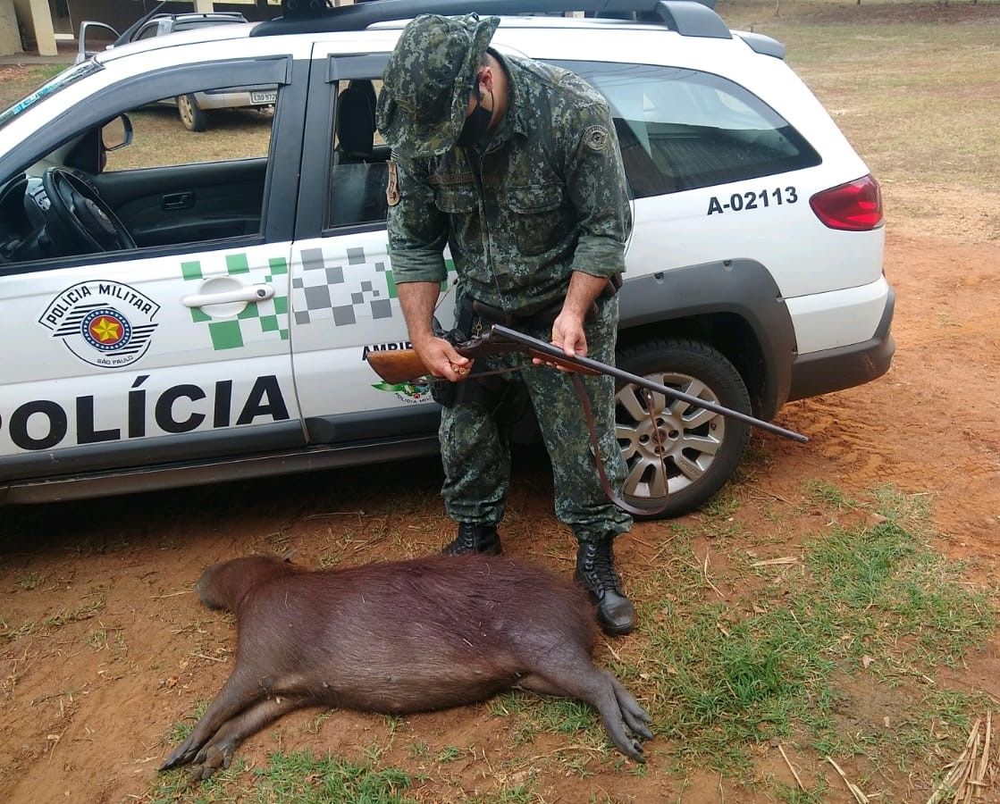 Um homem foi preso em flagrante, em Penápolis, depois de matar uma capivara com um tiro de espingarda. O caso foi nessa quinta, 3. Segundo o registro da polícia, durante um patrulhamento pela área do ribeirão Lajeado, os policiais escutaram o barulho de uma arma sendo disparada. Eles foram em direção ao ruído e encontraram o suspeito e o animal morto. No bolso dele, havia dois cartuchos de espingarda calibre 32. A arma estava na carroceria do veículo usado pelo suspeito.