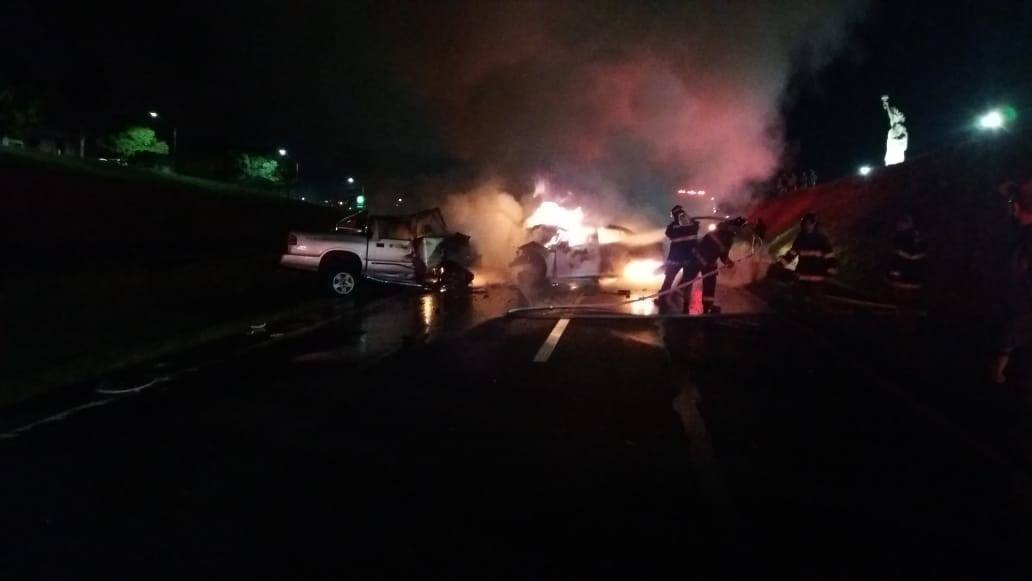 Equipes de resgate tentam controlas as chamas causadas pela colisão dos veículos - Foto: Reprodução/Facebook