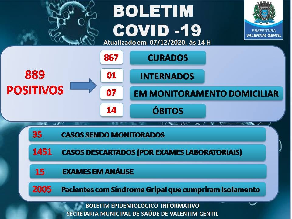 A Prefeitura de Valentim Gentil, por meio da Secretaria de Saúde, divulgou, nesta segunda-feira, dia 7, o boletim epidemiológico sobre os casos positivos de coronavírus (Covid-19).