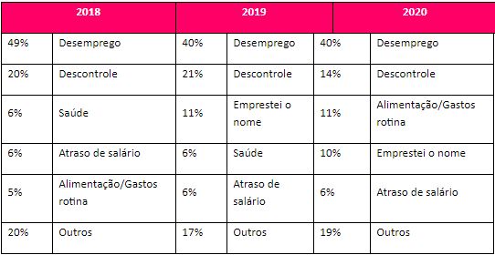 Outro fator relevante é que, apesar de estarmos no meio de uma pandemia, em 2020, o endividamento com gastos de saúde não está entre os mais citados como motivo de endividamento, diferentemente de 2018 e 2019.