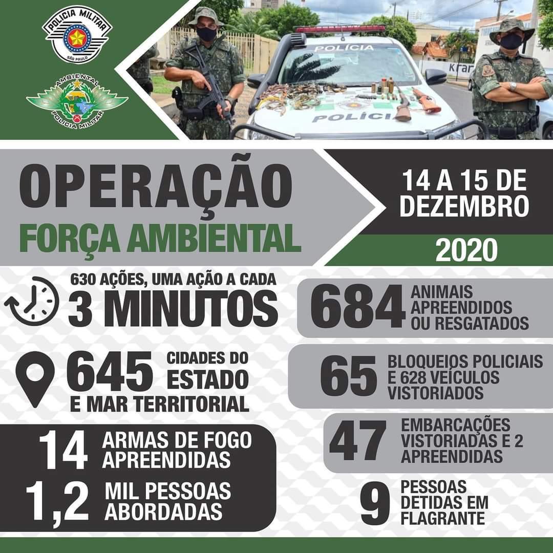 Realizada nos dias 14 e 15, a Operação foi desencadeada pela Polícia Militar Ambiental em todo o estado, contou com o emprego de 1.308 policiais militares ambientais e mais de 480 viaturas.