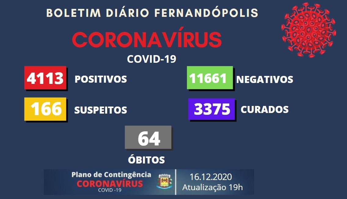Fernandópolis registrou nesta quarta-feira, 16, mais 54 casos positivos para coronavírus. O município soma agora 4.113 infectados pela doença.