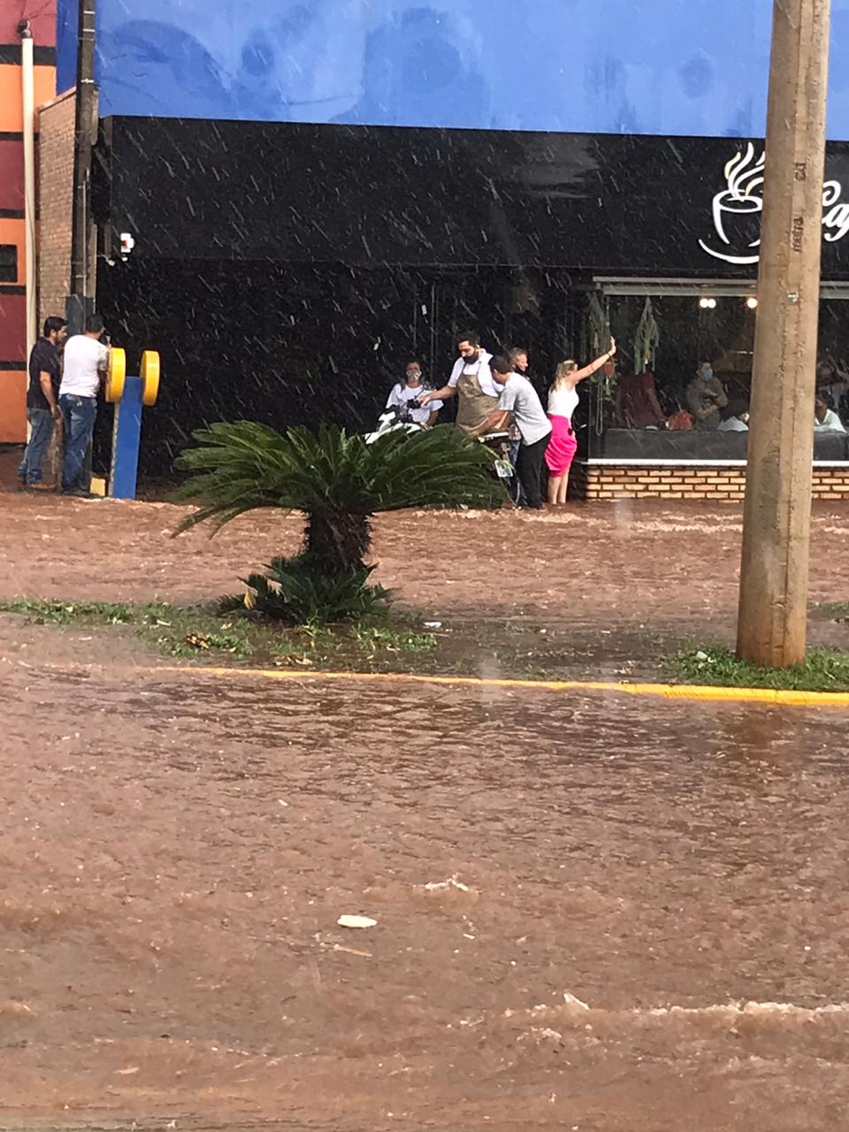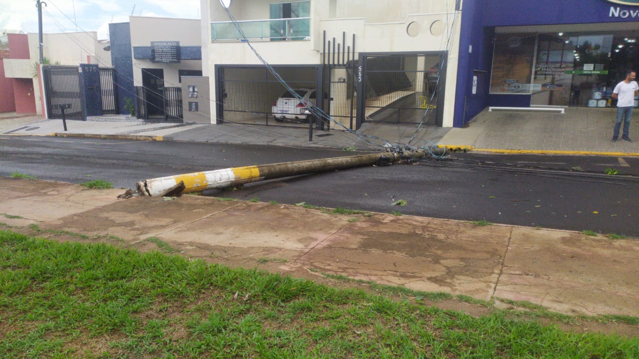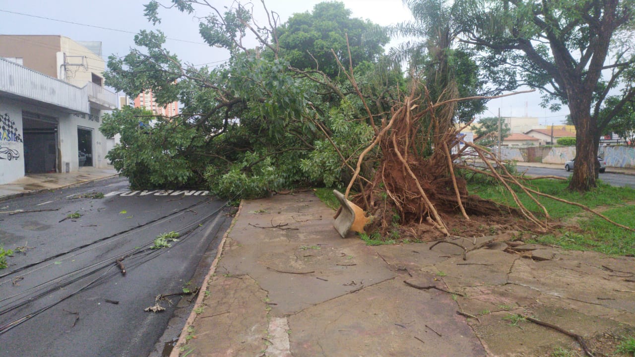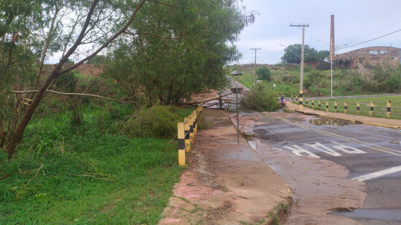Árvores e postes caíram com os fortes ventos que acompanharam a forte chuva, além de alagamento registrado na Avenida do Arnaldos.