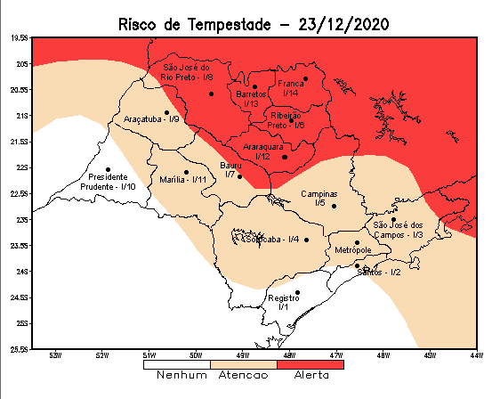 Segundo apurou a reportagem, a atenção é para os altos acumulados de chuva que pode provocar transtornos na região noroeste paulista com acumulados que podem atingir 50 mm em algumas regiões.