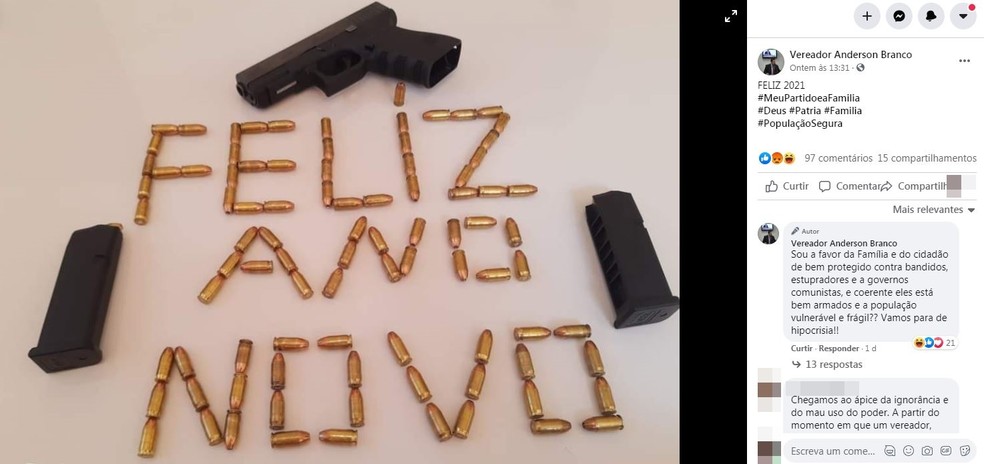 O vereador reeleito Anderson Branco (PL), de São José do Rio Preto, gerou polêmica na internet após publicar uma mensagem de Ano Novo com a imagem de arma e munições.