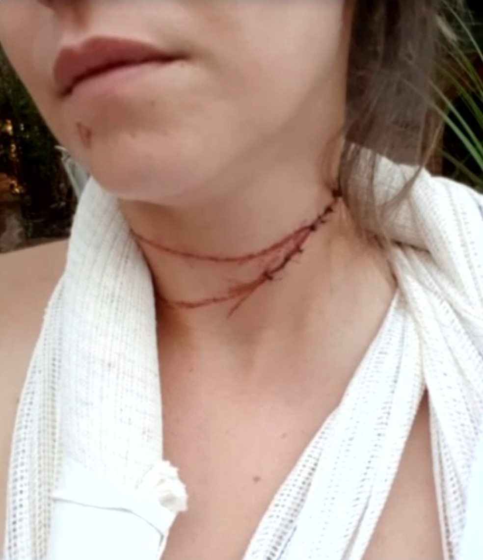 “Tentei colocar a mão na frente para desviar da linha, mas ela foi direto para o meu pescoço. Tanto é que tem dois rasgos. Perdi o controle da direção e tive a ideia de jogar a moto em um campinho. A moto pulou e encontramos uma árvore meio seca. Não sei se ela nos protegeu ou ajudou, mas conseguimos parar”, diz.