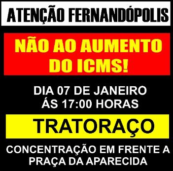 Está marcado para a próxima quinta-feira, 07, a partir das 17h um “tratoraço” em Fernandópolis e diversas outras cidades do interior paulista em protesto contra o aumento do ICMS sobre diversos itens e insumos, que devem onerar os custos de produção e potencialmente elevar os preços dos alimentos, combustíveis e até da energia elétrica. A manifestação está sendo organizada pelo Sindicato Rural da Alta Noroeste (SIRAN).