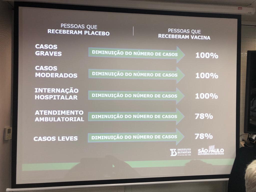 “A vacina mostrou 100% de eficácia contra casos graves e moderados. Não houve nenhum caso grave de COVID-19 entre os voluntários imunizados com a vacina do Butantan”, explicou o diretor da instituição, Dimas Tadeu Covas.