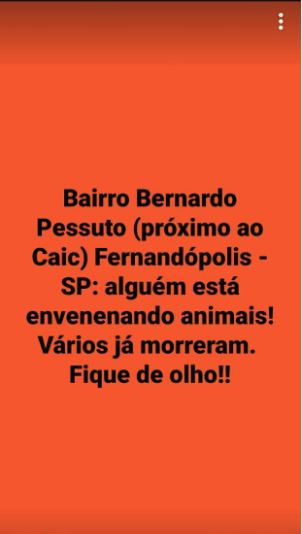 Os moradores dos bairros Vila Santa Rosa e Bernardo Pessuto, zona sul de Fernandópolis, e que têm animais domésticos, estão apreensivos após as mortes de seis animais, entre cães e gatos, que morreram em um período de quatro meses. Segundo os responsáveis pelos animais, eles foram envenenados.