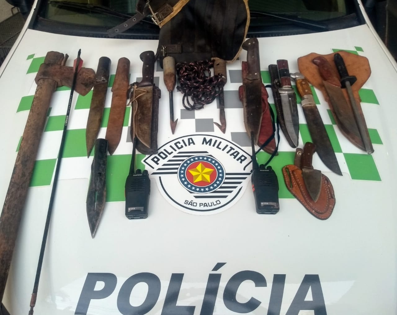 Com os infratores foram apreendidos diversos materiais, dentre eles: 05 facas, 01 facão, 01 chaira, 02 fisgas, 03 adagas, 02 rádios comunicadores, 01 machado, 01 flecha e 01 colete canino.