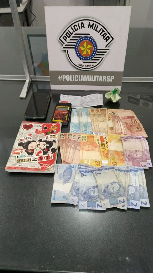 Além da droga, também foram apreendidos um celular e dinheiro - Foto: Divulgação/PM