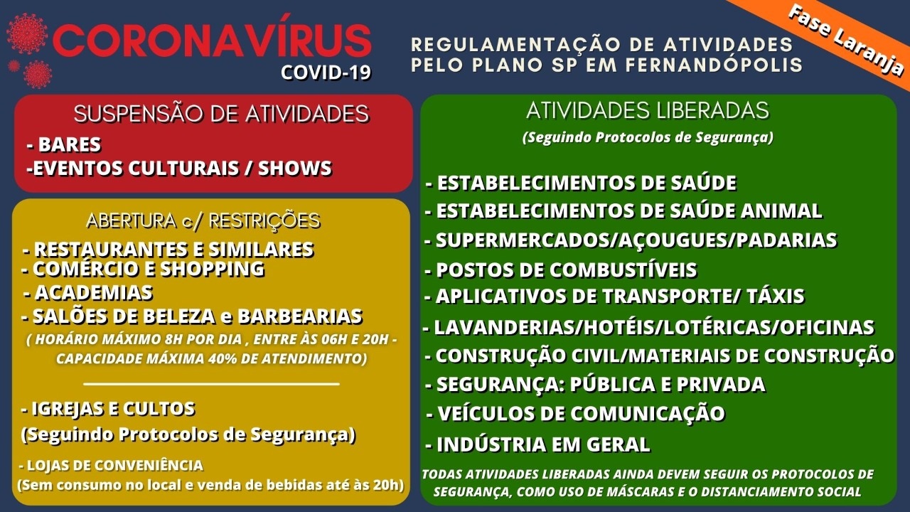 Atendendo às determinações estaduais, Fernandópolis está na Fase Laranja do Plano São Paulo de combate à pandemia de Coronavírus. As informações sobre o funcionamento comercial, empresarial e de serviços estão publicadas no Diário Oficial Municipal de 19 de janeiro de 2021.