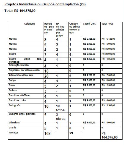 Os R$188.875,00 em premiação serão divididos da seguinte forma: R$ 84.000,00 para a manutenção de seis empresas culturais; e R$ 104.875,00 aos grupos artistas, os cachês variam de R$1.250,00 a R$6.000,00.