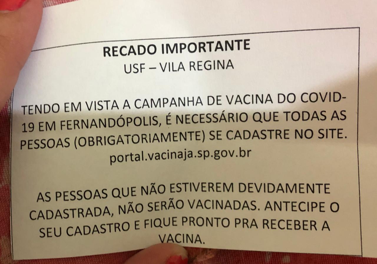 Em Fernandópolis, durante a semana, moradores de alguns bairros receberam em suas casas um bilhete, da Secretaria Municipal de Saúde, com orientações sobre as diretrizes da campanha contra a Covid-19.