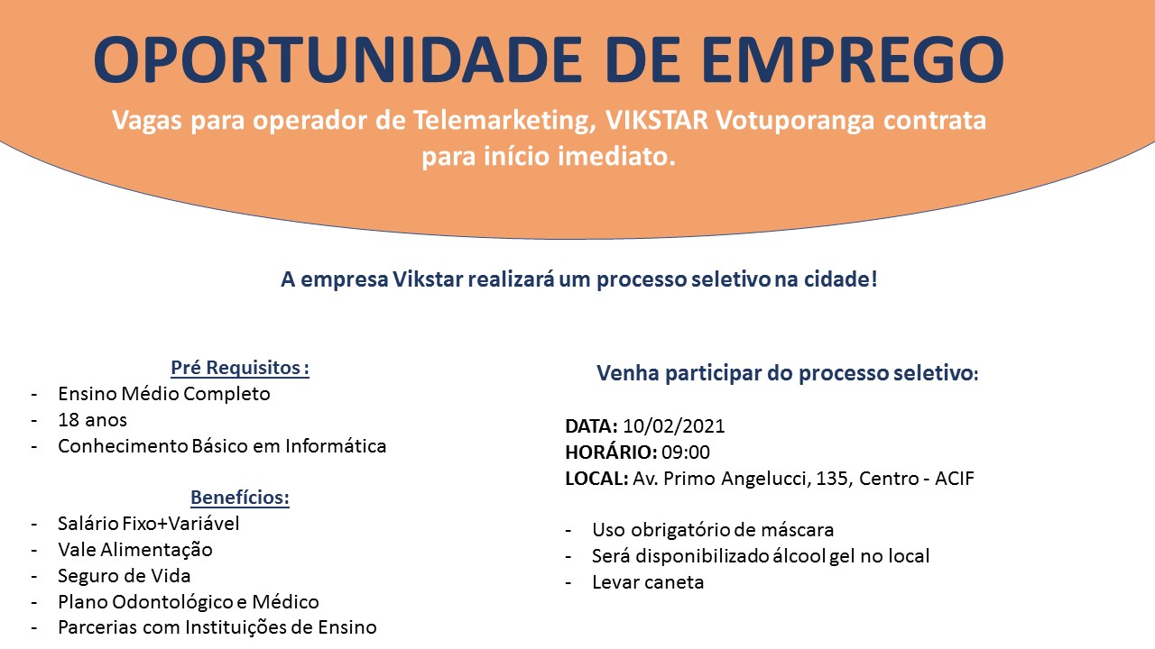 A empresa Vikstar realizará uma seleção de futuros funcionários moradores de Fernandópolis no dia 10 de fevereiro, às 9h, na Acif (Associação Comercial e Industrial de Fernandópolis). As vagas são para operadores de telemarketing.