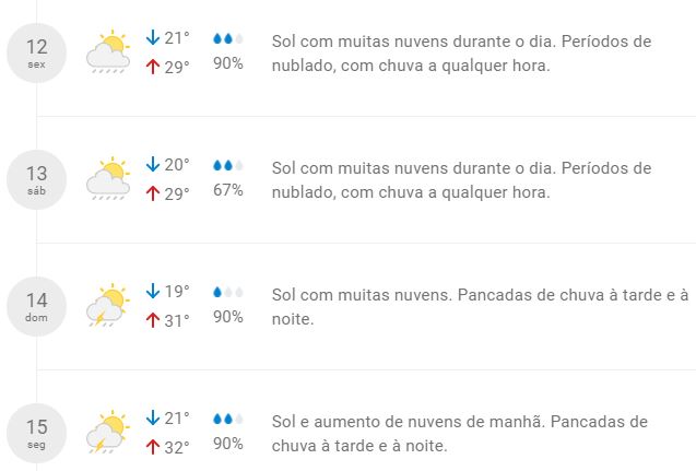 A temperatura deve variar entre 19º, no domingo, chegando até máximas de 32º na segunda e terça-feira.