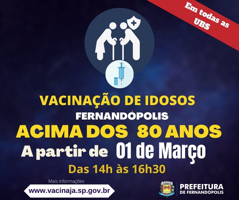 A Vigilância Epidemiológica da Secretaria Municipal de Saúde de Fernandópolis começará na próxima segunda-feira, 01 de março, a imunizar o público acima de 80 anos contra a COVID-19.