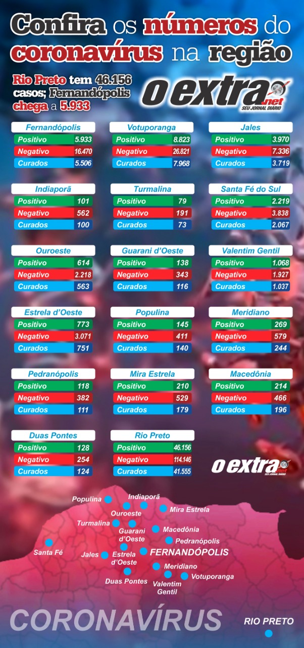 Fernandópolis confirmou nesta sexta-feira, 5.933 casos positivos. Destes, 5.506 estão curados da doença. O último boletim ainda informa que são 16.470 testes negativos e 95 óbitos.
