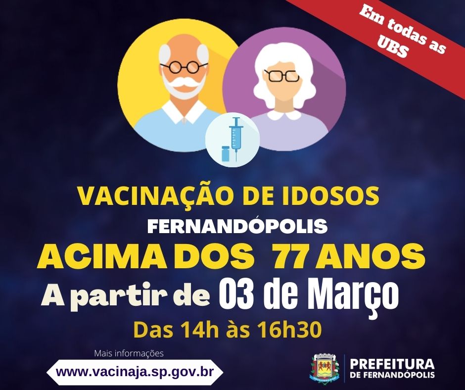 Terá início nesta quarta-feira, dia 03, a vacinação do público acima de 77 anos contra a COVID-19 em Fernandópolis. Para evitar aglomerações, a Secretaria Municipal de Saúde realizará o atendimento em todas as unidades de Saúde, vacinando esses idosos das 14h às 16h30.