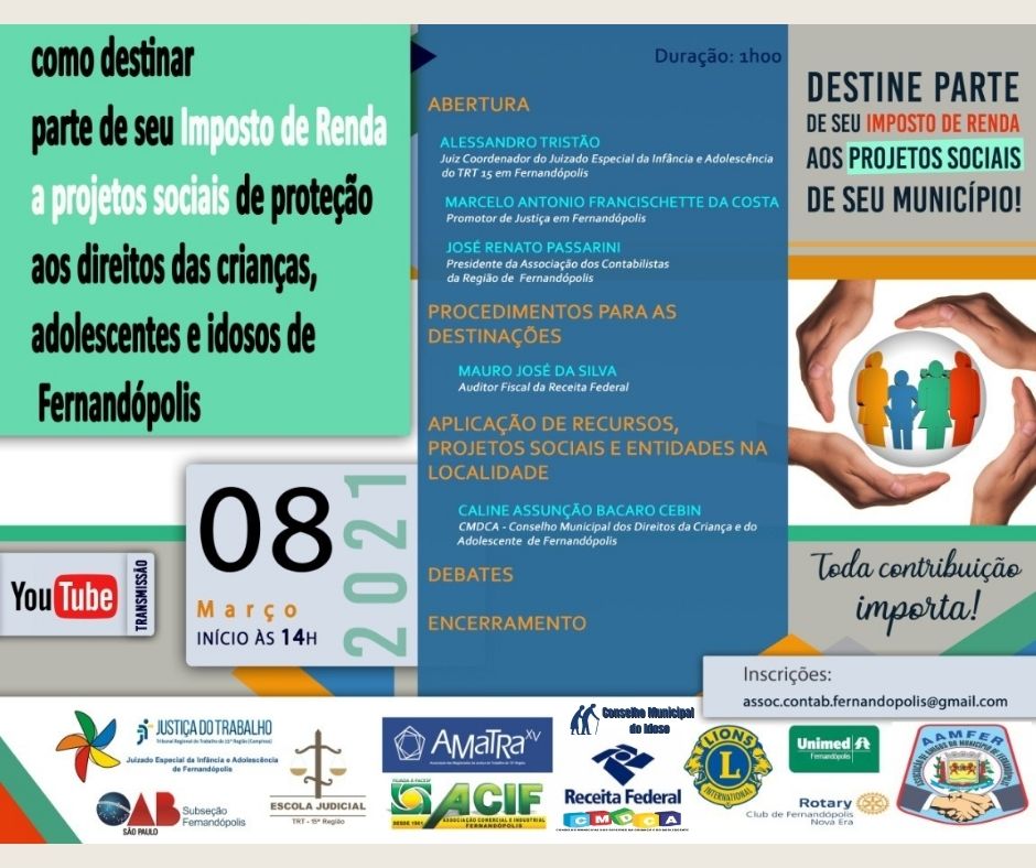 Parte do imposto de renda pago pelo contribuinte fernandopolense pode ser destinada para as entidades que atendem a crianças e idosos do município. Para explicar como fazer este procedimento, o JEIA (Juizado Especial da Infância e Adolescência) de Fernandópolis, com apoio de diversos parceiros, inclusive o CMDCA (Conselho Municipal dos Direitos da Criança e do Adolescente), realiza uma live na próxima segunda-feira, 8, às 14h.